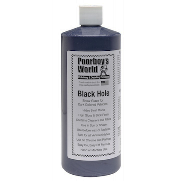 Poorboys Black Hole Show Glaze is formulated exclusively for dark colored vehicles. The glaze cleans and fills light swirl marks to leave a brilliant, glossy, slick show car shine. Poorboys Black Hole Show Glaze can be applied any time to hide minor imperfections and to enhance gloss on black, red, and all dark vehicles.