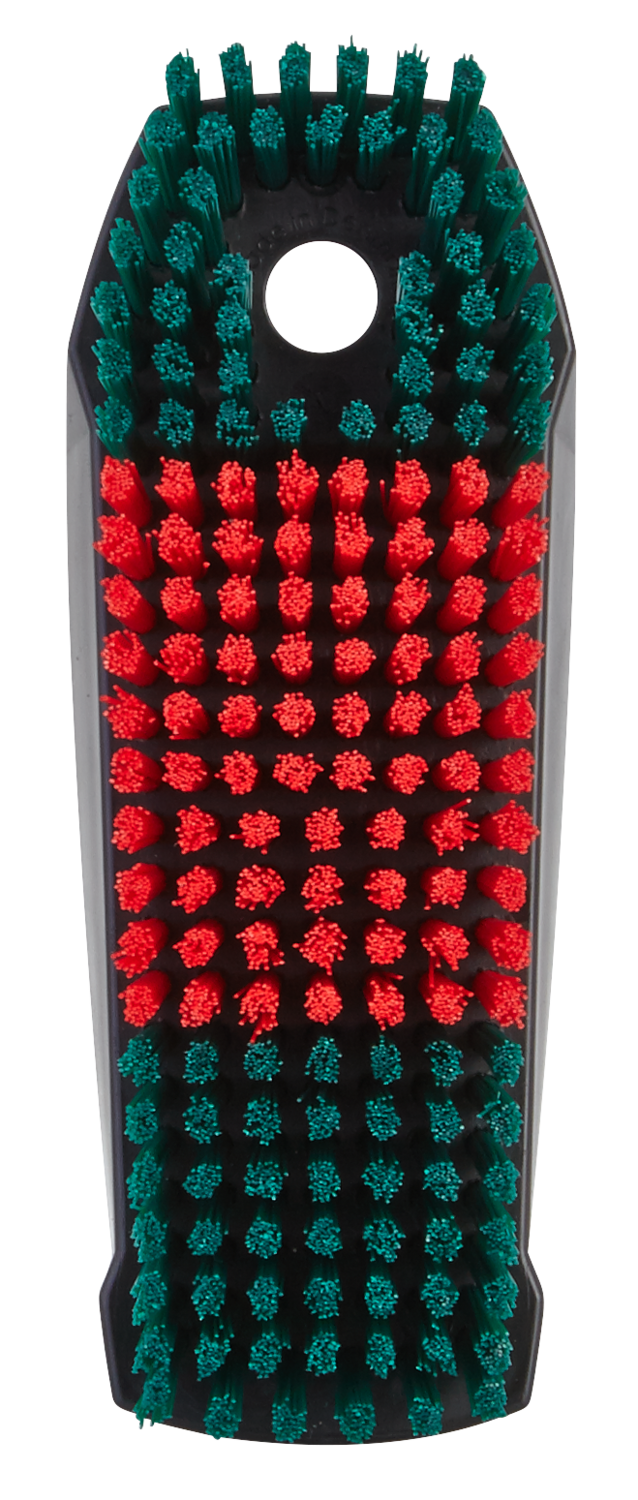 This Vikan Convertible / Carpet Fabric Brush is made of black solid polypropylene with stiff red and green polyester filaments.
