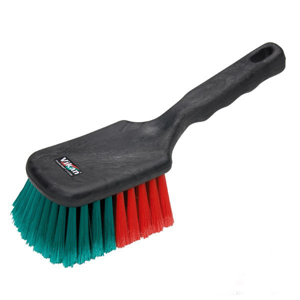 This Vikan Large Faced Wheel Brush is made from black foamed polypropylene handle with has soft red/green polyester filaments.
